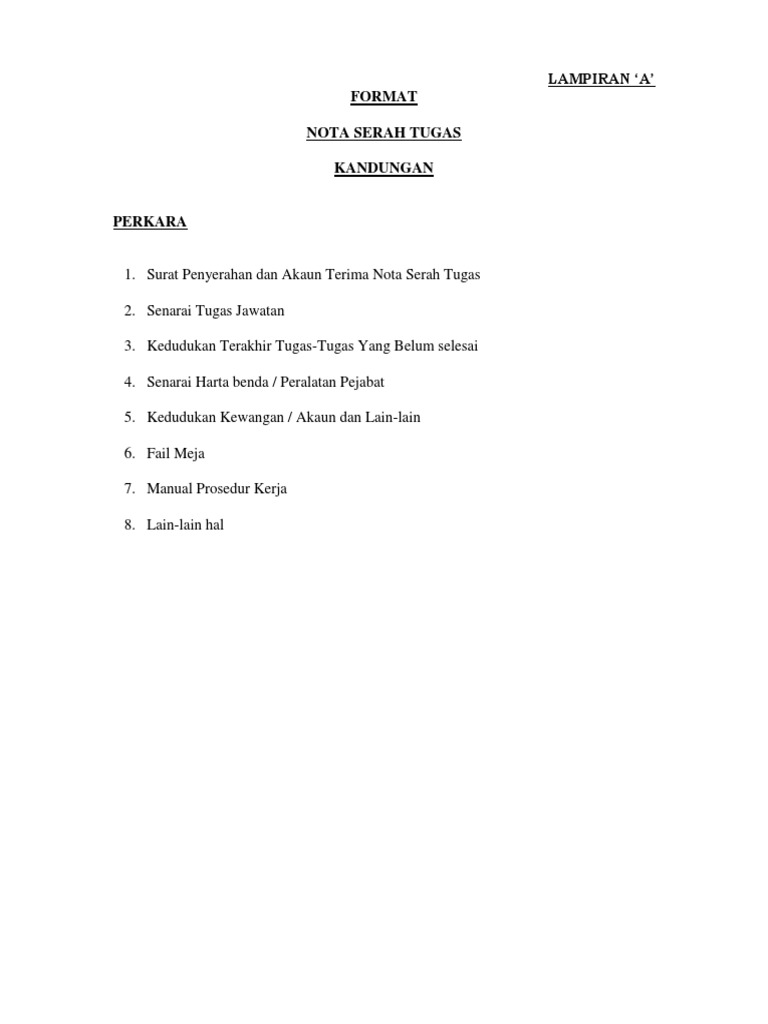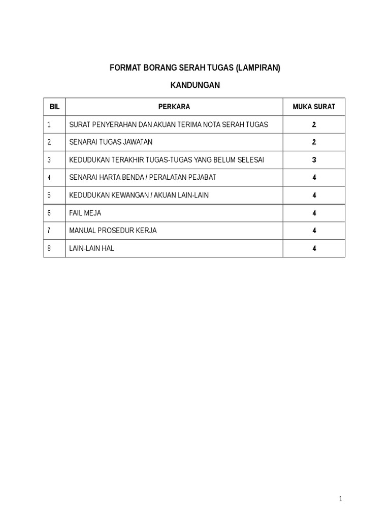 Doc Format Borang Serah Tugas Adika Roslan Academia Edu from 0.academia-photos.com 4.2 garis panduan format penyediaan nota serah tugas 4.2.1 perkara 1. Nota serah tugas ini seterusnya diserahkan kepada pegawai yang mengambilalih jawatan tersebut dan pegawai berkenaan hendaklah * download download:garis panduan download:contoh nota serah tugas lihat juga : Borang kutipan dan serahan guru ke pejabat darjah. Seorang guru juga memiliki tugas untuk melatih para muridnya agar memiliki keterampilan dan kecakapan dasar. Cara mengisi borang keberhasilan untuk penilaian komponen. Sppbs, sps akan diintegrasikan, ringakan tugas guru. Savesave borang nota serah tugas for later. Tugas pokok dan fungsi guru sebagaimana tertera dalam uu no.