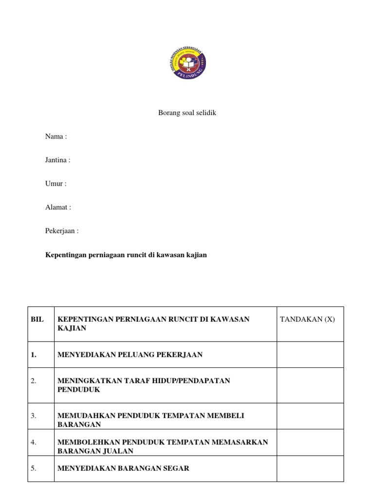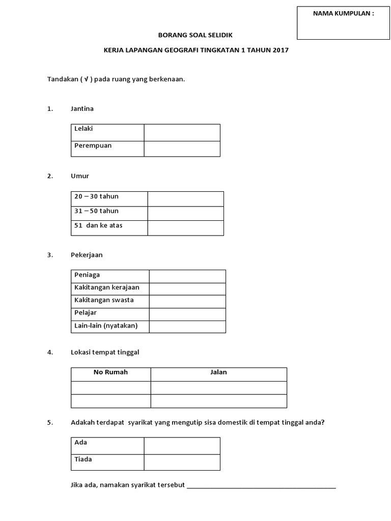Contoh Borang Soal Selidik 1 from imgv2-1-f.scribdassets.com Borang kaji atau soal selidik ini perlu dibuat dalam perlaksanaan dan disertakan dalam pelaporan tugasan wajib bagi ujian pelbagai instrumen (geografi) pentaksiran tingkatan 3 (pt3) kajian lapangan atau lebih dikenali sebagai kerja kursus, agar menjelaskan lagi hasil dapatan dan maklumat yang. Ia merupakan satu alat yang dibentuk secara khusus untuk mengumpul maklumat bagi tujuan analisis. Penggunaan teknologi moden dalam proses pembuatan keropok di kampung telaga daing, kuala terengganu,terengganu. Documents similar to contoh borang soal selidik kajian pengajian am. Borang aduan, contoh borang keberhasilan, contoh borang pendaftaran pelajar, contoh borang pengesahan kehadiran, contoh borang soal selidik geografi, contoh borang pbd, contoh borang e b, contoh borang soal selidik geografi pt3 2017. Borang temubual soalan kajian guna tanah. Contoh borang soal selidik pencemaran udara geografi pt3. Contoh borang soal selidik untuk demografi 30 responden pengajian am stpmfull description.