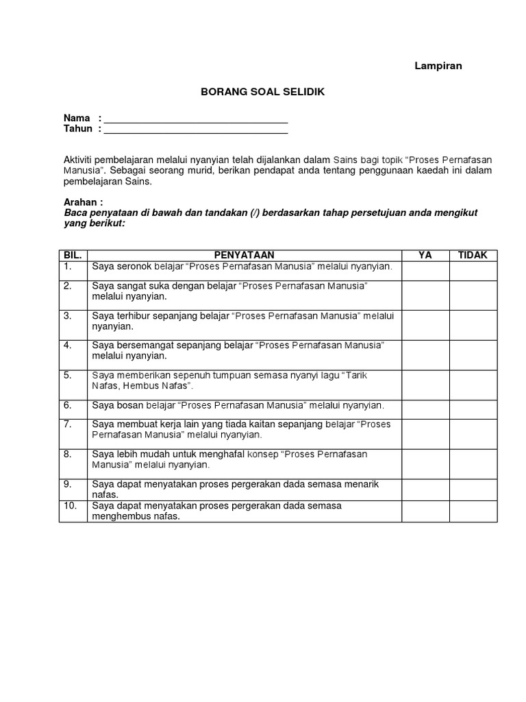 Related : Contoh Borang Soal Selidik Kajian / Borang kaji atau soal selidik ini perlu dibuat dalam perlaksanaan dan disertakan dalam pelaporan tugasan wajib bagi ujian pelbagai instrumen (geografi) pentaksiran tingkatan 3 (pt3) kajian lapangan atau lebih dikenali sebagai kerja kursus, agar menjelaskan lagi hasil dapatan dan maklumat yang..