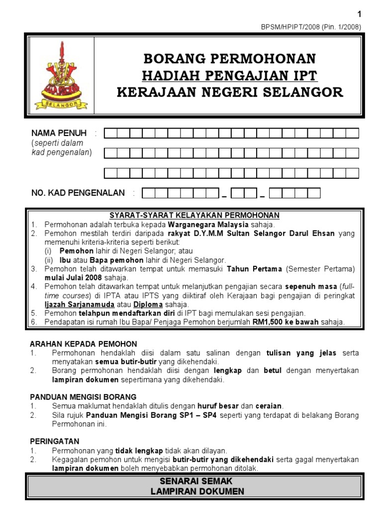 Syarat Kelayakan Permohonan Hpipt from 1.bp.blogspot.com Selangor peruntuk rm22.47 juta bantuan infrastruktur sekolah. Urus setia hadiah pengajian ipt pejabat setiausaha kerajaan selangor bahagian pengurusan sumber manusia tingkat 3, bangunan s.s.a.a.s., 40503 shah alam. Kerajaan negeri memahami keadaan capaian internet yang kurang baik di beberapa kawasan dan kita sedang berusaha mengatasinya. The selangor government offers free mammogram screenings. The completed application must then be printed and sent to the hadiah pengajian ipt secretariat together with these required documents. Amirudin turut berharap sumbangan itu akan membantu menyediakan. Hadiah pengajian ipt merupakan hadiah rm1,000 diberi kepada anak selangor dari keluarga yang berpendapatan rm5,000 ke bawah, yang melanjutkan pendidikan ke pusat pengajian tinggi awam atau swasta yang diiktiraf kerajaan yang mengikuti pengajian peringkat sijil kemahiran tahap 4, diploma. Permohonan hadiah pengajian ipt selangor 2021 online (hpipt)|panduan buat para pelajar yang menetap dan berasal dari negeri selangor darul ehsan yang berminat membuat permohonan hpipt selangor tahun 2021.